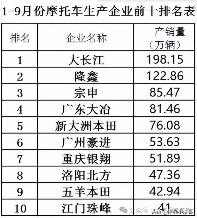 1-9月,燃油摩托车销量前十名企业(集团)为大长江、隆鑫、宗申、广东大冶、新大洲本田、广州豪进、重庆银翔、洛阳北方、五羊-本田、江门市珠峰。