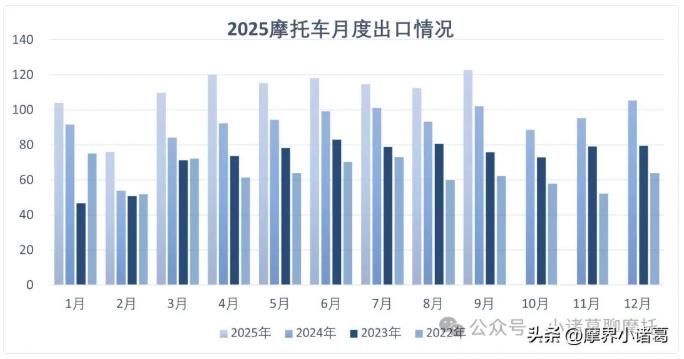 1-9月,摩托车生产企业产品出口总额81.36亿美元,同比增长26.42%。整车出口量996.74万辆,同比增长22.82%,出口金额65.96亿美元,同比增长28.78%。摩托车发动机出口97.41万台,同比增长15.36%,出口金额1.94亿美元,同比增长7.21%。