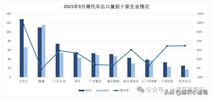 1-9月,摩托车出口量排名前十位的企业依次为:大长江、隆鑫、广东大冶、宗申、广州豪进、重庆银翔、新大洲本田、江门市珠峰、重庆千里科技、航天巴山,上述十家企业共出口611.55万辆,占摩托车出口总量的61.36%。