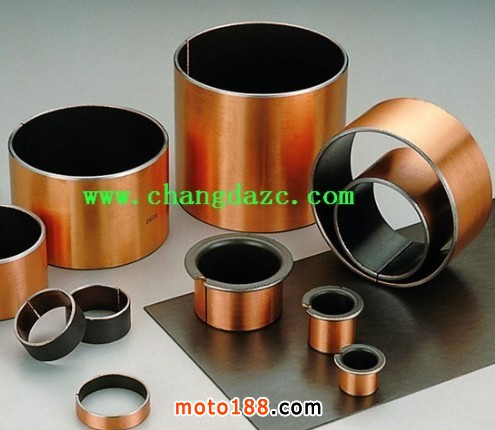 是以钢板为基体,中间烧结球形青铜粉,表面轧制聚四氟乙烯(PTFE)和铅的混合物,卷制而成的法兰无油轴承。它具有摩擦系数小、耐磨、抗腐蚀性好,无油润滑的特点。使用该产品能降低成本、缩小机械体积、避免咬轴现象和降低机械噪音等优点。
