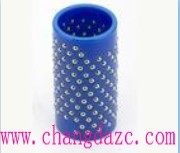 密珠型钢球保持架/模具导柱导套/钢珠导套,分别以铜合金、硬铝合金、POM树脂为基体,并在其外圆表面上,加工出排列有序、大小适当,形状特殊的孔穴,在其孔穴中镶入滚动轴承钢球。孔口采用最新的沟槽圆周锁球工艺,有效地解决了传统式点式锁球和压痕锁球不能完全防止钢球脱落的难题。孔底加工出90°止口使铜球在孔内自由转动而不脱落。由于钢球的直径大于保持圈的壁厚,所以在使用时钢球高出保持圈内、外圆表面,直接与相配的孔与轴接触,使基体(保持圈)浮于中间,并且相配的孔与轴半径之差小于钢球直径,即钢球与之配合为过盈配合,配合精度高,轴与孔相对运动灵活。是保持圈的更新换代产品。