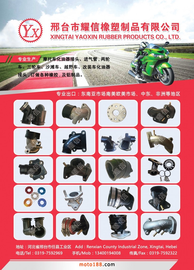 专业生产摩托车化油器接头、进气管,两轮车、三轮车、沙滩车、越野车、改装车化油器接头,订做各种橡胶及铝制品。主要出口东南亚市场、南美