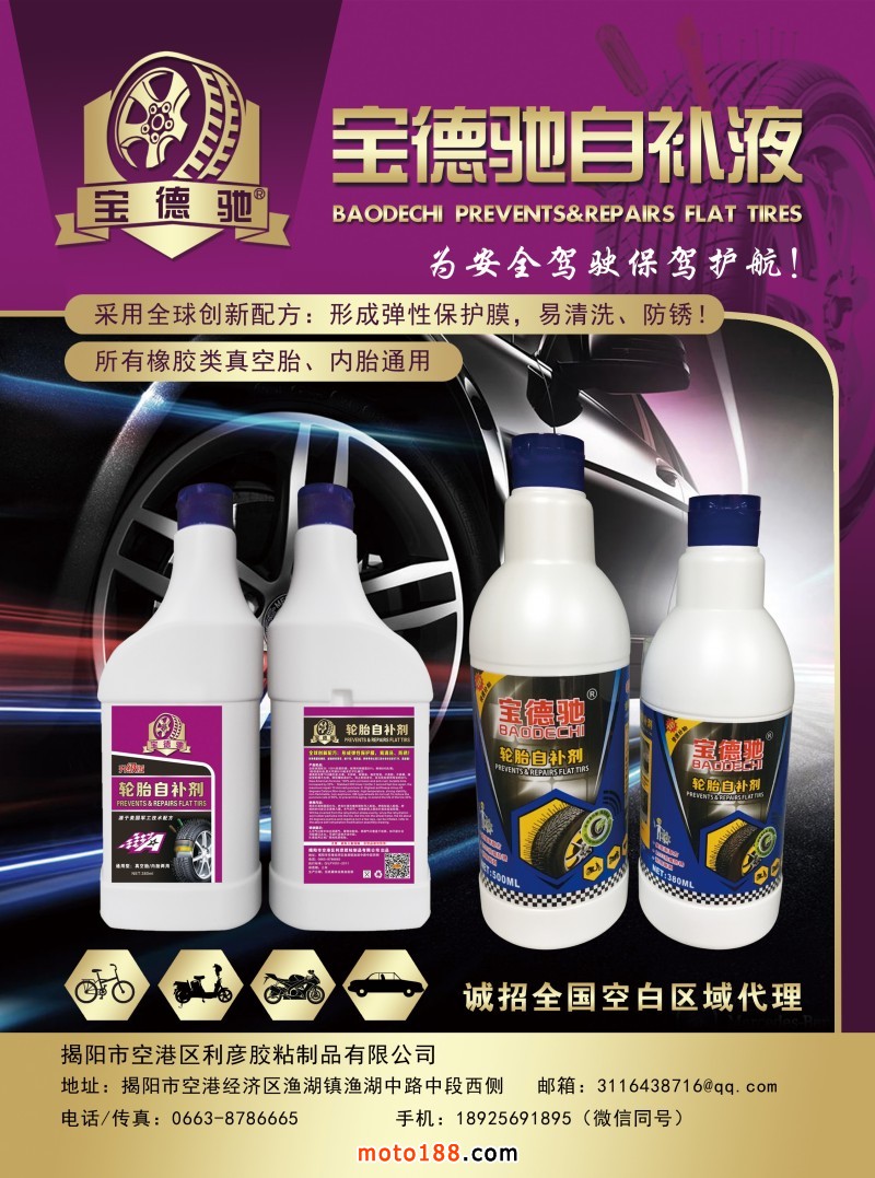 宝德驰轮胎自补液,适用于自行车、电动车、摩托车、汽车等所有橡胶类真空胎、内胎,创新配方:形成弹性保护膜,易清洗、防锈、防冻零下30度!诚招全国空白区域代理,欢迎来电,咨询热线/微信:18925691895,陈先生