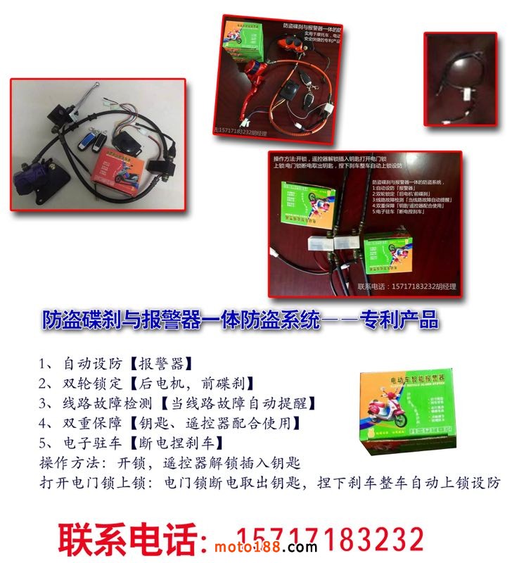 防盗碟刹与报警器一体的防盗系统,实用于摩托车,电动车的防盗,安全快捷的专利产品。