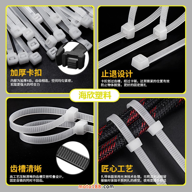 我公司专业生产:优质尼龙扎带、汽车扎带,电瓶车专用扎带,耐高温扎带,耐低温扎带,高低温扎带 等产品,也可来样定制,拥有完整、科学的质量管理体系。乐清市海欣塑料有限公司的诚信、实力和产品质量获得业界的认可。欢迎各界朋友莅临参观、指导和业务洽谈。