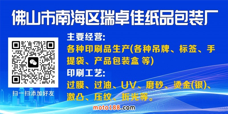 【佛山市南海区瑞卓佳纸品包装厂】主要经营:各种印刷品生产(各种吊牌、标签、手提袋、产品包装盒 等)印刷工艺:过膜、过油、UV、磨砂、烫金(银)、激凸、压纹、折光等。
