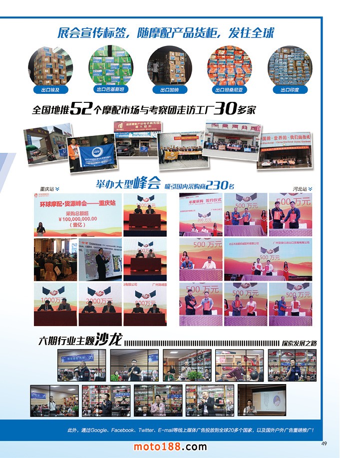 今年十一月份中汽全摩会继续在广州召开,为了做好外贸服务工作,抓住一带一路走向世界的发展契机,我们将我们的外贸数据库整理发布给业内人士,在广州全摩会正式推出首版《中国摩配外贸市场指南》,用中英文双语出版,正度16开,尺寸为266×181毫米。