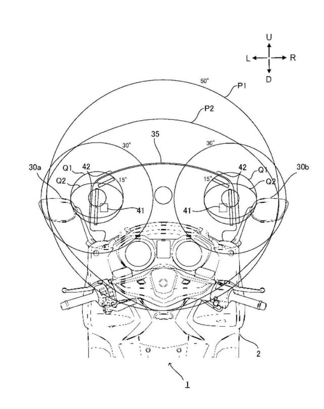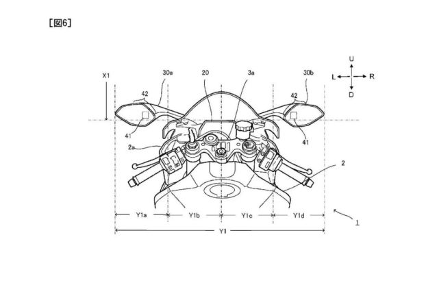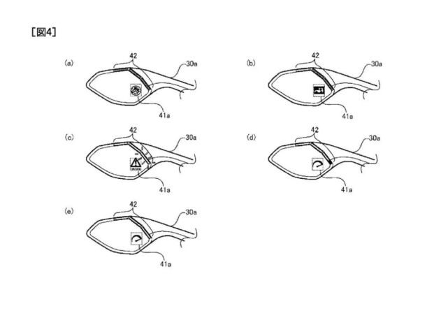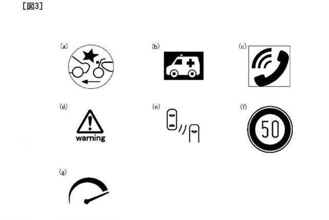 雅马哈便针对这个问题,将盲点侦测警示整合进后视镜,让骑士在不分心的状况下接收这些信息。专利中总共出现前车碰撞、紧急车辆靠近、来电、警告标志、盲点侦测、时速限制提醒、超速提醒七种图标,仅有安全相关的重要讯息才会显示在后照镜上,其它的转速、时速、油量、里程仍是通过TFT仪表显示
