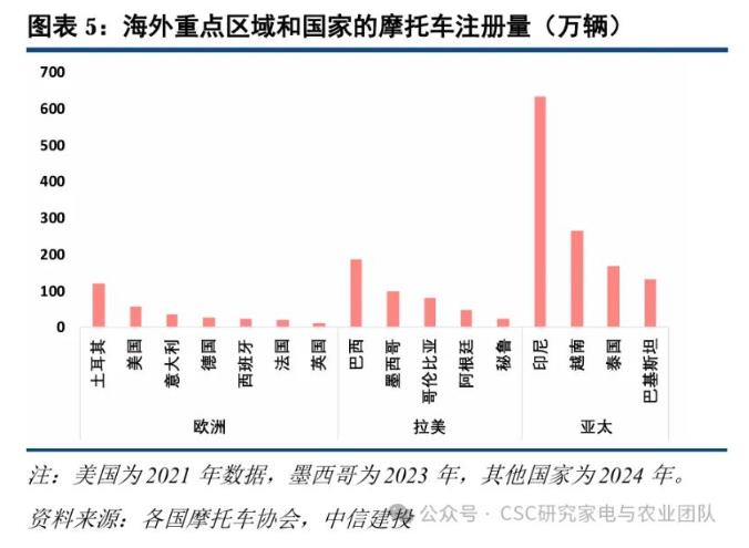 中信建投数据显示,2024年全球摩托车销量达6000万辆,摩托车主要市场集中在亚太、拉美和欧美。