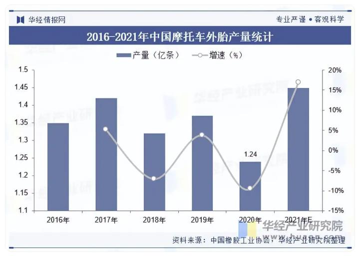 2020年整体疫情导致出行需求下降,我国摩托车轮胎产量仅为1.24亿条,较2019年的1.37亿条下降了0.13亿条,下降幅度为9.49%,据预计2021年我国摩托车外胎产量将超1.45亿条。随着轮胎市场的回暖,我国摩托车行业的发展将得到有力的支撑。
