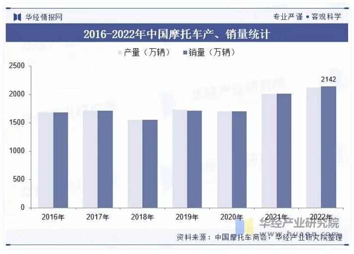 2022年我国摩托车产销量均突破2100万辆,年产量自2016年的1682.1万辆上涨至2022年的2129.22万辆,停止了2014年以来产量持续缩减的颓势;我国摩托车年销量自2016年的1680万辆增长至2022年的2142万辆,年均复合增长率达到3.53%。