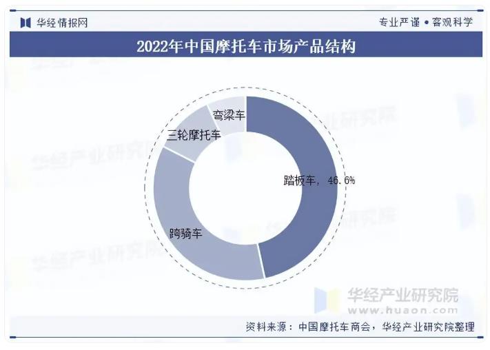 当下,我国摩托车市场中踏板车的份额逐步扩大。2022年二轮摩托车和三轮摩托车的销量占比分别为89.31%、10.69%,其中二轮摩托车中踏板车占比最大,达46.64%,跨骑车和弯梁车的销量占比分别为35.85%、6.82%。