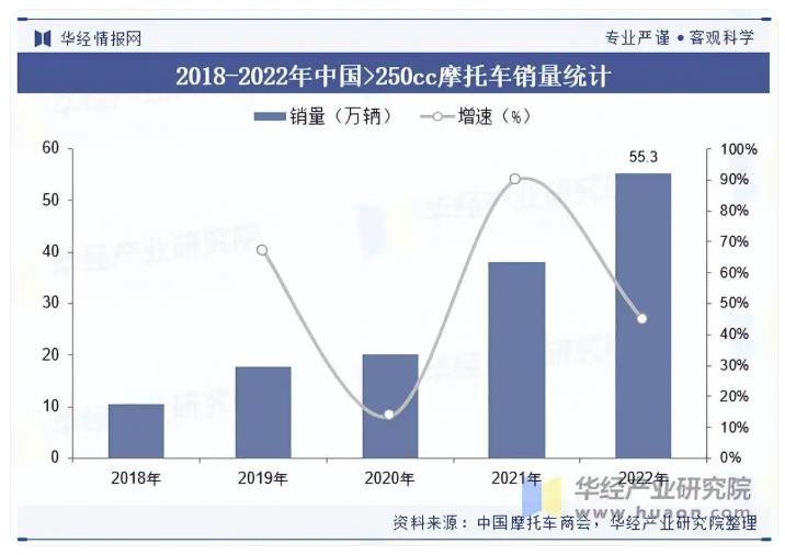 从排量结构上看,我国两轮摩托车主要以50-250ml为主流排量段,合计占比达90%以上,而50ml以下的小排量产品市场则逐渐萎缩至5%左右。其中>250cc中大排量摩托车2022年销量55.3万辆,同比增长44.7%,18-22年销量CAGR高达51.2%,但占整体销量比例仅2.6%。未来,随着我国摩托车休闲文化产业步入快速发展期,国内用户对于外观设计新颖、性能更强、中大排量休闲娱乐车型的需求将进一步增长,其市场仍有较大的发展空间。