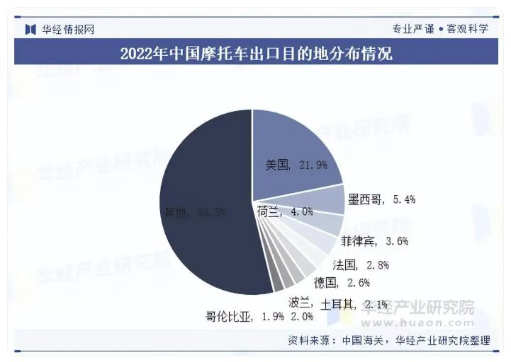 从摩托车(包括装有驱动电动机的摩托车及脚踏车)出口地区分布情况来看,2022年,美国、墨西哥、荷兰、菲律宾和法国为我国摩托车出口量前五的国家,出口量占比分别为21.9%、5.4%、4.0%、3.6%和2.8%。