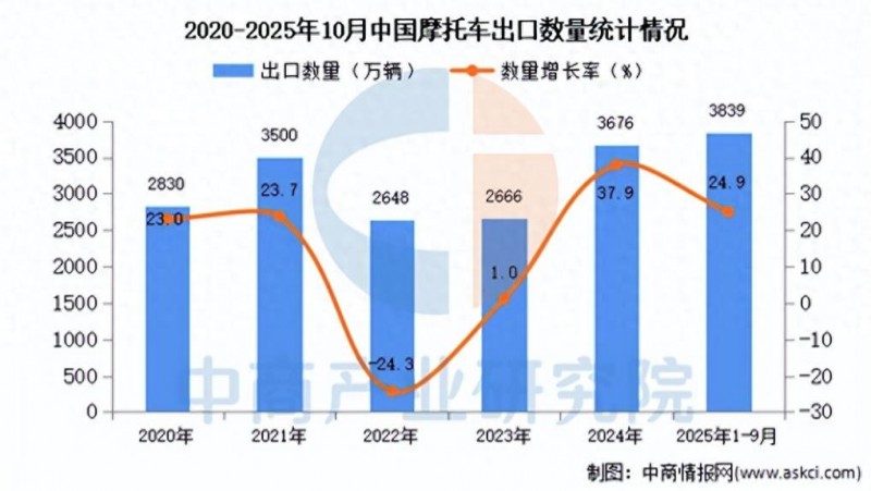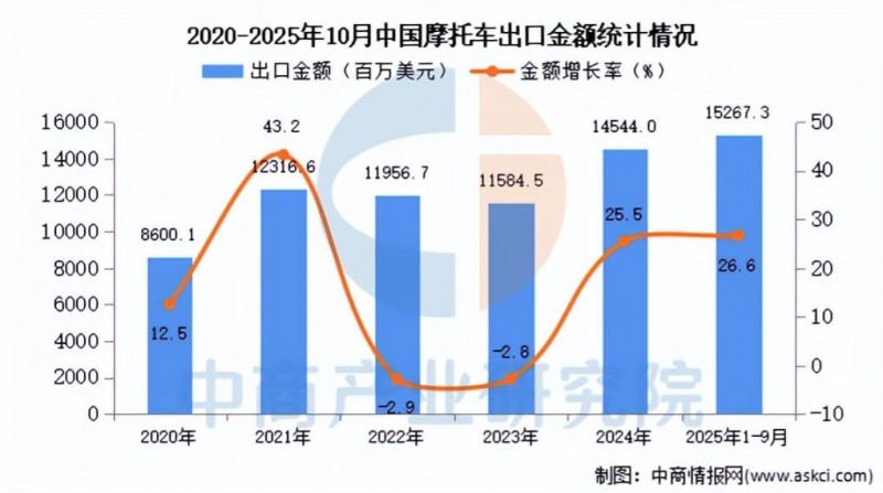 从金额方面来看,数据显示,2025年1-10月中国摩托车出口金额15267.3百万美元,同比增长26.6%。