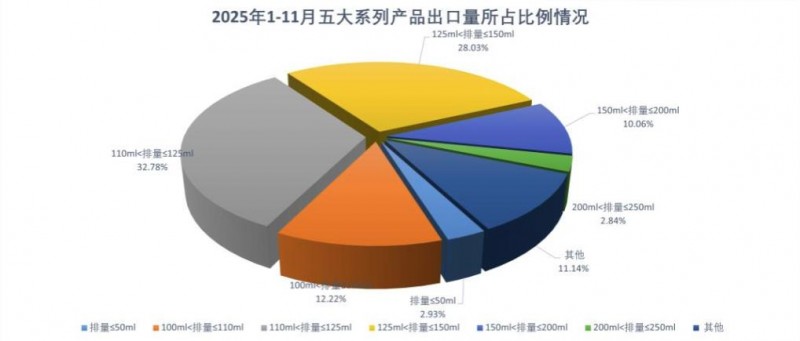 1-11月份,国产摩托车出口量位居前六位的系列品种分别是:125cc、150cc、110cc、200cc、50和250cc,从中可以看到小排量车型在海外市场更受欢迎,且呈现出了明显的增长势头。