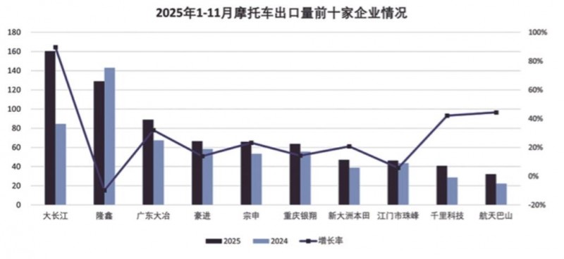 外贸出口作为行业增长的“稳定器”和“压舱石”,在2025年继续发挥重要作用。2025年1-11月,摩托车生产企业产品出口总额达99.17亿美元,同比增长25.21%。其中整车出口1208.23万辆,同比增长21.27%,出口金额79.93亿美元,同比增长27.26%,“价”的增幅持续高于“量”的增幅,表明出口产品单价和附加值稳步提升。