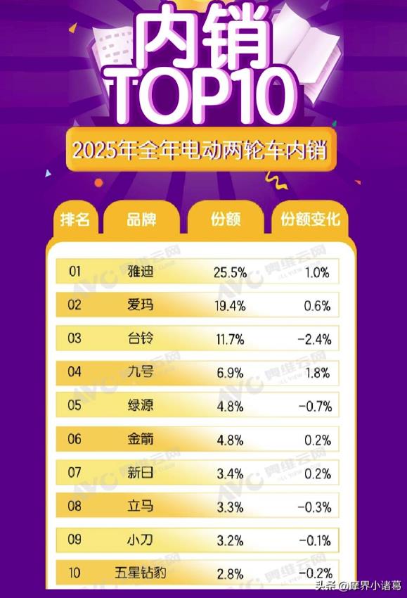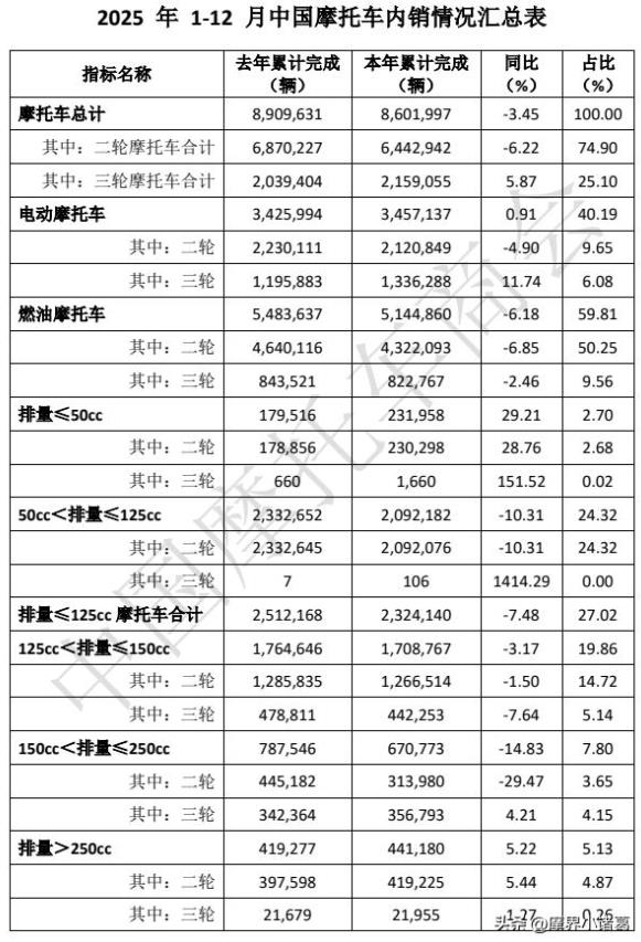 其实,燃油摩托车的现状就是被电摩冲击的结果,所以,回答这个问题,我们用数据说话。据电动车行业发布的数据,2025年电动车全行业产销5200万辆,其中头部品牌雅迪、爱玛、台铃产销量分别为1300万辆、1000万辆、800万辆。而中国摩托车商会发布的2025年燃油摩托车内销总量为514.49万辆,其中两轮摩托车产销432.2万辆,比上一年下滑了6.18%。而且电动车大多还是以内销为主,出口占比并不大。