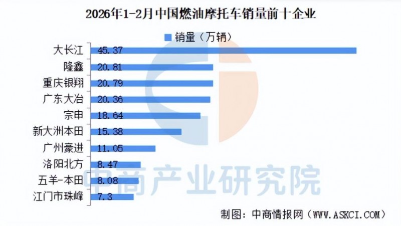 1-2月,燃油摩托车销量前10名企业(集团)为大长江、隆鑫、重庆银翔、广东大冶、宗申、新大洲本田、广州豪进、洛阳北方、五羊-本田、江门市珠峰,分别销售摩托车45.37万辆、20.81万辆、20.79万辆、20.36万辆、18.64万辆、15.38万辆、11.05万辆、8.47万辆、8.08万辆、7.3万辆,10家企业共销售摩托车176.25万辆,占摩托车总销量的59.89%。