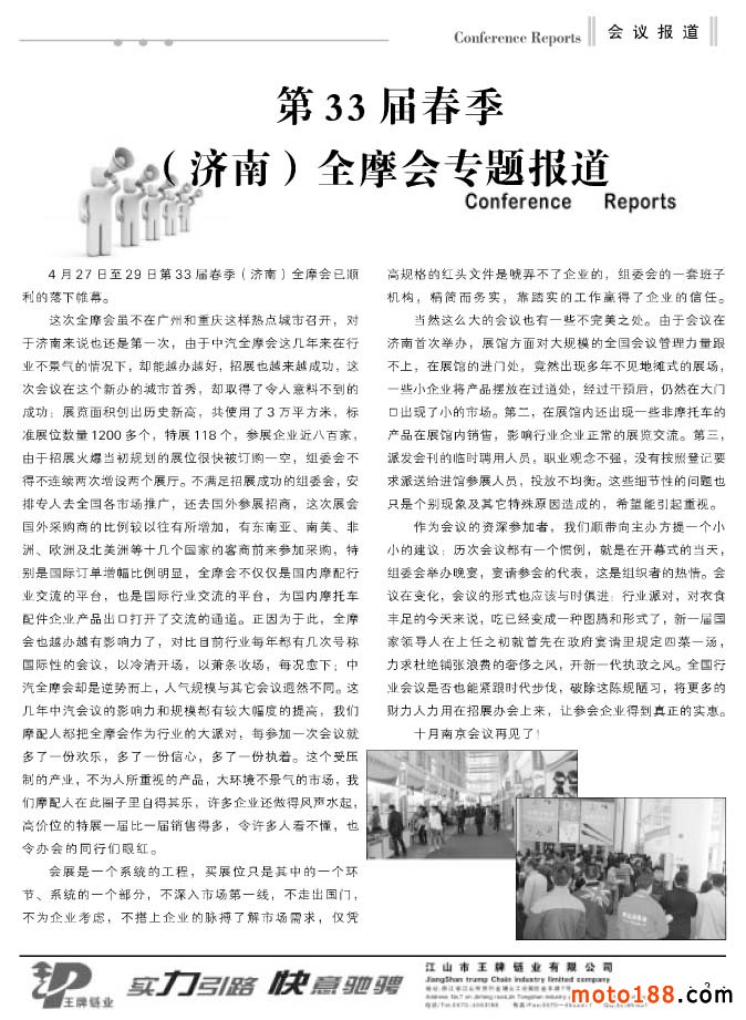 5月17至19日在义乌举办了第八届中国义乌汽车摩托车及配件用品展会,虽然这次会议规模不算大,但和去年相比,参会的厂家却比去年有所增加,去年是三十几家,今年有五十多家。义乌作为全国最大的小商品城,来自世界各地的商人在义乌随处可见,这是一个外贸氛围浓厚的世界商贸城,尤其是中东地区客户。在义乌沪江路还有一个不大的摩配小市场,去年这里有二十六家在批零经营,这次去只有十几家了。我们将参会所带的报纸、杂志和大全,给每家都投放了。虽然这次会议规模小,但我们收入颇丰。这次会议参会的媒体较少,我们《摩托车与配件》杂志更显突出,在会上我们还结识了一些新的客户。浙江地区的企业参会观展来的比例较多,厂家还有来自重庆、江苏、广东、福建及湖南等各省市的。会议以汽车配件和汽车用品为主,这个会议如果能有较多的买家进场的话,也还是算有一定特色的。