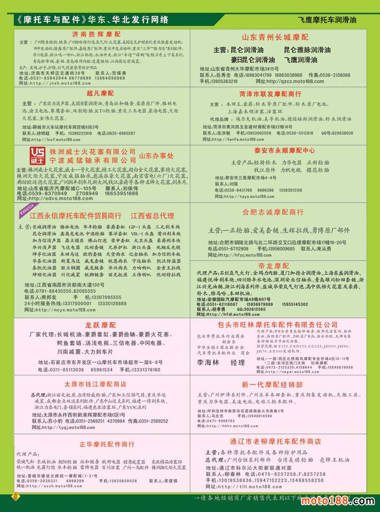 在这个淡季里,我们还将去西北和东北送书、送报上万,走访调研这些地区的市场。再次强调,我们送的书是今年上半年在济南全摩会首发的新版《中国摩托车配件生产企业大全》,送的报纸是《摩托车与配件外贸报》。我们的杂志还是由全国各发行点直接发放给市场上的经营商户。目前《大全》已完成在山东、河北、广东和重庆等省市的主要市场的发行。今年年底之前完成对全国市场的投放。