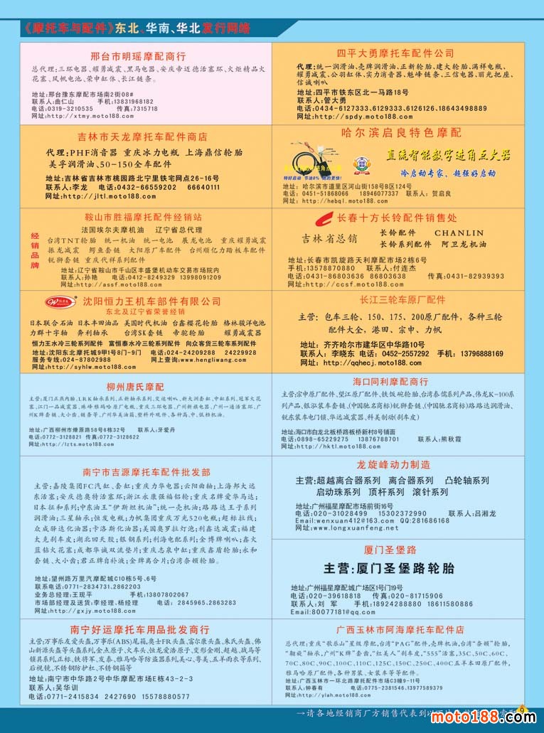 在这个淡季里,我们还将去西北和东北送书、送报上万,走访调研这些地区的市场。再次强调,我们送的书是今年上半年在济南全摩会首发的新版《中国摩托车配件生产企业大全》,送的报纸是《摩托车与配件外贸报》。我们的杂志还是由全国各发行点直接发放给市场上的经营商户。目前《大全》已完成在山东、河北、广东和重庆等省市的主要市场的发行。今年年底之前完成对全国市场的投放。