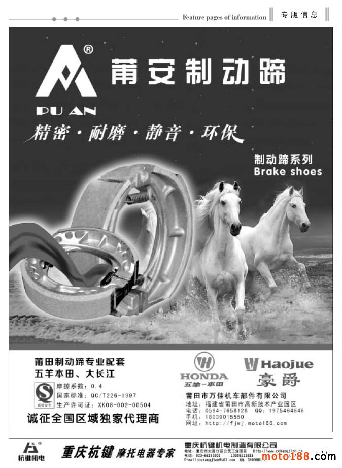 经过几次改刊后的发行情况来看,我们这种根据市场变化灵活出刊的形式逐步被企业所认可。在发行上我们也是没有打折扣,月出刊两期后,黑白的内容要比过去丰富得多,可读性也在增强。六月变单期后,我们另增加8页黑白的文字信息内容,黑白每期为40页。由于北方市场和南方市场淡旺季同期相反,所以在南方的淡季里,我们杂志在北方市场的发行数量将增加。不管南北市场淡旺不同,对我们来说,我们仍将一如既往地做好我们的工作。从今年6月份开始,我们工作人员将分别去福建、浙江、安徽和江西四省,走访调研这四省的摩配市场,并将派送上万份《外贸报》和工具书《配件生产企业大全》。同时,我们还将收集市场的最新资料,为下半年的《华东市场指南》做出书的准备工作。目前这项工作进展顺利,广告征集也在稳步进行。完成这些省份的调研工作,我们的信息采集工作也就到了收官阶段。工作进展快的话,我们就会提前结束这本书的编排。在10月24日的南京全摩会上,大家就可以看到这本书了。