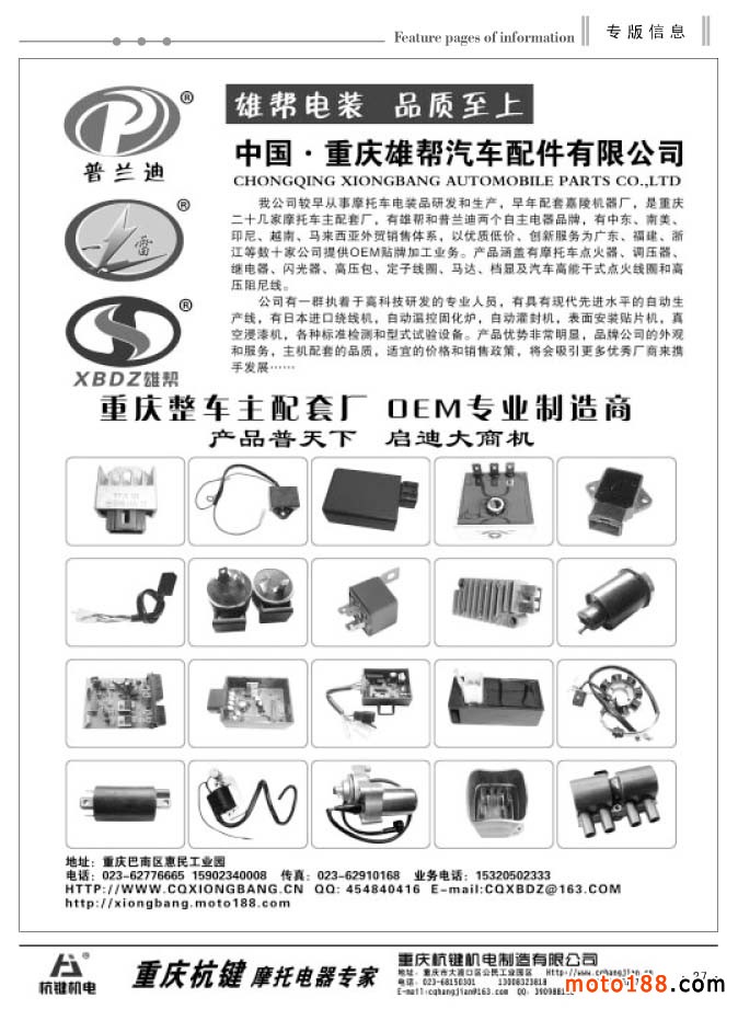 在这个淡季里,我们还将去西北和东北送书、送报上万,走访调研这些地区的市场。再次强调,我们送的书是今年上半年在济南全摩会首发的新版《中国摩托车配件生产企业大全》,送的报纸是《摩托车与配件外贸报》。我们的杂志还是由全国各发行点直接发放给市场上的经营商户。目前《大全》已完成在山东、河北、广东和重庆等省市的主要市场的发行。今年年底之前完成对全国市场的投放。