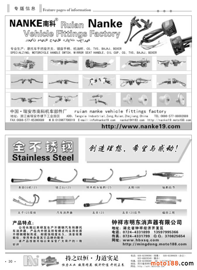 经过几次改刊后的发行情况来看,我们这种根据市场变化灵活出刊的形式逐步被企业所认可。在发行上我们也是没有打折扣,月出刊两期后,黑白的内容要比过去丰富得多,可读性也在增强。六月变单期后,我们另增加8页黑白的文字信息内容,黑白每期为40页。由于北方市场和南方市场淡旺季同期相反,所以在南方的淡季里,我们杂志在北方市场的发行数量将增加。不管南北市场淡旺不同,对我们来说,我们仍将一如既往地做好我们的工作。从今年6月份开始,我们工作人员将分别去福建、浙江、安徽和江西四省,走访调研这四省的摩配市场,并将派送上万份《外贸报》和工具书《配件生产企业大全》。同时,我们还将收集市场的最新资料,为下半年的《华东市场指南》做出书的准备工作。目前这项工作进展顺利,广告征集也在稳步进行。完成这些省份的调研工作,我们的信息采集工作也就到了收官阶段。工作进展快的话,我们就会提前结束这本书的编排。在10月24日的南京全摩会上,大家就可以看到这本书了。