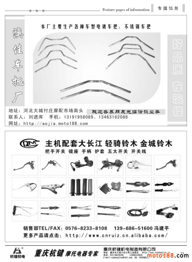 经过几次改刊后的发行情况来看,我们这种根据市场变化灵活出刊的形式逐步被企业所认可。在发行上我们也是没有打折扣,月出刊两期后,黑白的内容要比过去丰富得多,可读性也在增强。六月变单期后,我们另增加8页黑白的文字信息内容,黑白每期为40页。由于北方市场和南方市场淡旺季同期相反,所以在南方的淡季里,我们杂志在北方市场的发行数量将增加。不管南北市场淡旺不同,对我们来说,我们仍将一如既往地做好我们的工作。从今年6月份开始,我们工作人员将分别去福建、浙江、安徽和江西四省,走访调研这四省的摩配市场,并将派送上万份《外贸报》和工具书《配件生产企业大全》。同时,我们还将收集市场的最新资料,为下半年的《华东市场指南》做出书的准备工作。目前这项工作进展顺利,广告征集也在稳步进行。完成这些省份的调研工作,我们的信息采集工作也就到了收官阶段。工作进展快的话,我们就会提前结束这本书的编排。在10月24日的南京全摩会上,大家就可以看到这本书了。