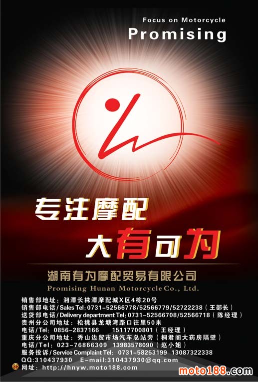 《中国摩托车配件市场指南》系列丛书,经过三年一个轮回,我们将对全系列丛书进行第二次的升级,这本书在今年下半年江苏省会南京举办的三十三届秋季全摩会正式首发。在这之前,我们先在第十二届重庆国际博览会会上发行,本书在部分华东市场先行投放,除了华东市场全覆盖外,在广州和重庆重要市场也由工作站人员送书上门,另外我们的www.moto188.com网站也将在首页摆放一年,在网站上可以在线阅读,也可以下载离线阅读,不上网也可以脱机浏览。