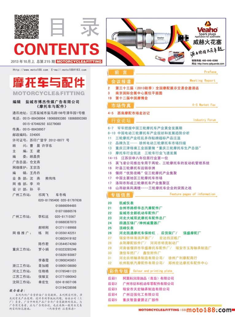 本次杂志因为要参加10月17-20日在重庆国际博览中心举办的第十二届中国国际摩托车博览会,在这个展会上我们还将《中国摩托车配件华东市场指南》带到会上发行,因而我们在过完中秋节后,工作就十分繁忙。为了能保证及时参展,我们都在赶点,这之中还包括国庆假日,印刷厂还要放假,江苏到重庆的在途运输时间等。为了兑现我们出版发行的承诺,我们也只有努力工作。