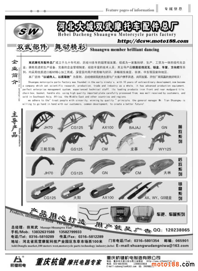 本次杂志因为要参加10月17-20日在重庆国际博览中心举办的第十二届中国国际摩托车博览会,在这个展会上我们还将《中国摩托车配件华东市场指南》带到会上发行,因而我们在过完中秋节后,工作就十分繁忙。为了能保证及时参展,我们都在赶点,这之中还包括国庆假日,印刷厂还要放假,江苏到重庆的在途运输时间等。为了兑现我们出版发行的承诺,我们也只有努力工作。