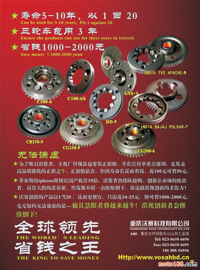 目前摩托车配件企业面临比较严峻的市场现状,但是我们了解到许多企业并不是坐以待毖,同时这个行业也在各个方面寻求突破,并且迎来了新的商机。我们杂志明年在信息发布上,也将增加和摩配行业有关的外延,如电动摩托车、三轮摩托车、助力车、小型通机等。这些零部件,都是我们配件厂能制造的,技术也是相通的。目前电动摩托、三轮摩托,小型通机市场都很不错,产销两旺,有的还是有良好的发展远景。除了通过纸媒来推广和普及外,我们的网站也将同时增加这方面的动态信息,发布即时报道,开通这几个板块的专题,为行业传输更多的信息;我们的网站也将在今冬明春大改版,进一步扩容。在严峻的形势下,我们一定要逆流而上,拓展生存和发展空间,同时我们也会将这几方面的信息向行业传递,供行业企业决策参考。当然我们更要在市场的第一线增加发行,补充完善这几方面的信息数据库。这些工作先从各省会城市开始,由大市场向小市场拓展,充分利用现行发行网络的功能,增加不同行业和市场的发行。