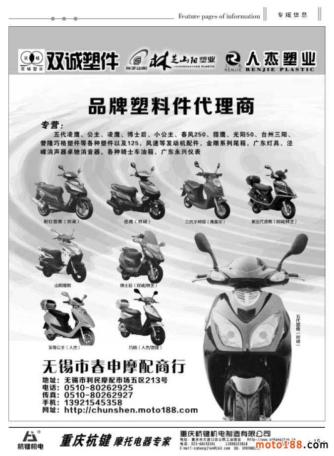 目前摩托车配件企业面临比较严峻的市场现状,但是我们了解到许多企业并不是坐以待毖,同时这个行业也在各个方面寻求突破,并且迎来了新的商机。我们杂志明年在信息发布上,也将增加和摩配行业有关的外延,如电动摩托车、三轮摩托车、助力车、小型通机等。这些零部件,都是我们配件厂能制造的,技术也是相通的。目前电动摩托、三轮摩托,小型通机市场都很不错,产销两旺,有的还是有良好的发展远景。除了通过纸媒来推广和普及外,我们的网站也将同时增加这方面的动态信息,发布即时报道,开通这几个板块的专题,为行业传输更多的信息;我们的网站也将在今冬明春大改版,进一步扩容。在严峻的形势下,我们一定要逆流而上,拓展生存和发展空间,同时我们也会将这几方面的信息向行业传递,供行业企业决策参考。当然我们更要在市场的第一线增加发行,补充完善这几方面的信息数据库。这些工作先从各省会城市开始,由大市场向小市场拓展,充分利用现行发行网络的功能,增加不同行业和市场的发行。