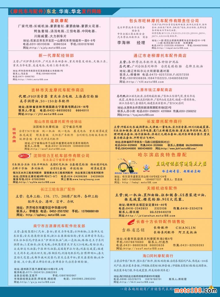 目前摩托车配件企业面临比较严峻的市场现状,但是我们了解到许多企业并不是坐以待毖,同时这个行业也在各个方面寻求突破,并且迎来了新的商机。我们杂志明年在信息发布上,也将增加和摩配行业有关的外延,如电动摩托车、三轮摩托车、助力车、小型通机等。这些零部件,都是我们配件厂能制造的,技术也是相通的。目前电动摩托、三轮摩托,小型通机市场都很不错,产销两旺,有的还是有良好的发展远景。除了通过纸媒来推广和普及外,我们的网站也将同时增加这方面的动态信息,发布即时报道,开通这几个板块的专题,为行业传输更多的信息;我们的网站也将在今冬明春大改版,进一步扩容。在严峻的形势下,我们一定要逆流而上,拓展生存和发展空间,同时我们也会将这几方面的信息向行业传递,供行业企业决策参考。当然我们更要在市场的第一线增加发行,补充完善这几方面的信息数据库。这些工作先从各省会城市开始,由大市场向小市场拓展,充分利用现行发行网络的功能,增加不同行业和市场的发行。