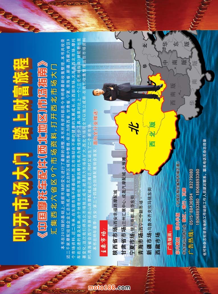 还有两个月的时间,行业盛会就要在西安拉开帷幕。这两个月也是我们忙碌的季节,我们要完成《西北市场指南》的编排和制作,这是原《三北市场指南》的升级版,将以前的东北、西北、华北三个地区的市场,独立出来。因为目前西北摩托车及配件市场发展已今非昔比,西北五省,陕、甘、宁、青、新,每一个省的市场都有较大的变化,他们不是像华东地区越变越小,而是越变越大。市场的吞吐量、品种以及市场的规模和形象都在改变。大家在这次全摩会之后,不妨拿着我们的《西北指南》循着指南的方向到这些市场走一走,就会有更深的感知,甚至能给你带来不少的商机。另外,我们还根据市场的新变化,将市场里的三轮车和电动车经销企业也收录在《西北指南》里,和我们杂志新的定位一样,将相关的行业一网打尽。需要开拓西北市场的企业,在这本《西北市场指南》上做宣传展示自己企业形象,一定会对得起你的投入。目前这本书也进入了编排倒计时,三月底就截稿印刷,需要宣传的企业请尽快与我们总部及分布在各地工作站的人员联系。