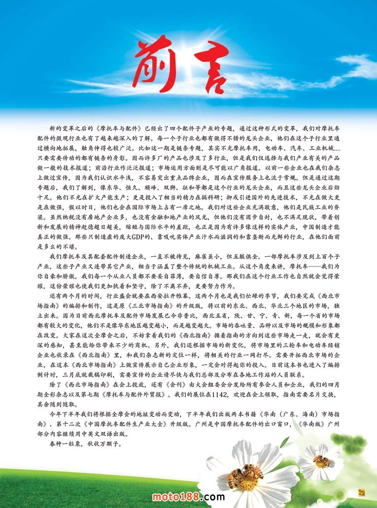 还有两个月的时间,行业盛会就要在西安拉开帷幕。这两个月也是我们忙碌的季节,我们要完成《西北市场指南》的编排和制作,这是原《三北市场指南》的升级版,将以前的东北、西北、华北三个地区的市场,独立出来。因为目前西北摩托车及配件市场发展已今非昔比,西北五省,陕、甘、宁、青、新,每一个省的市场都有较大的变化,他们不是像华东地区越变越小,而是越变越大。市场的吞吐量、品种以及市场的规模和形象都在改变。大家在这次全摩会之后,不妨拿着我们的《西北指南》循着指南的方向到这些市场走一走,就会有更深的感知,甚至能给你带来不少的商机。另外,我们还根据市场的新变化,将市场里的三轮车和电动车经销企业也收录在《西北指南》里,和我们杂志新的定位一样,将相关的行业一网打尽。需要开拓西北市场的企业,在这本《西北市场指南》上做宣传展示自己企业形象,一定会对得起你的投入。目前这本书也进入了编排倒计时,三月底就截稿印刷,需要宣传的企业请尽快与我们总部及分布在各地工作站的人员联系。