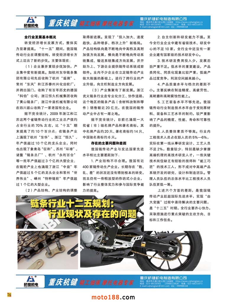 新的变革之后的《摩托车与配件》已经出了四个配件子产业的专题,通过这种形式的变革,我们对摩托车配件的微观行业也有了越来越深入的了解。每一个子行业也都有做得不错的龙头企业,他们在这个子行业里通过横向地拓展,触角伸得也较广泛。比如这一期是链条专题,其实不光摩托车用,电动车、汽车、工业机械....只要需要传动的都有链条的身影。因而许多厂的产品也涉及了多行业,但是我们仅选择与我们产业有关的产品做一般的技术报道;前沿行业作泛泛报道;市场运用方面则是尽可能以广角报道。以前一些企业也在我们杂志上做过宣传,因为我们认识水平浅,不容易突出重点品牌企业,因而在宣传服务上也流于常规。但是通过这期专题后,我们了解到,像东华、恒久、顺峰、双狮、征和等都是这个行业的龙头企业,而且这些龙头企业后劲十足。他们不光在扩大产能生产;更是投入了相当的精力在搞科研;抑或引进国外的先进技术,不光在做大更是在做强,假以时日,他们也会在国际市场上占有一席之地。我们对这些企业充满敬意,他们是民族工业的脊梁。虽然纳税没有房地产企业多,也没有金融和地产业的风光,但他们没有固步自封,也不满足现状,带着创新和发展的精神赶德超日超美,缩短与国际水平的差距,也正是因为有许多像这样的实体产业,中国制造才能真正的做强。那些只制造虚的庞大GDP的、靠吸吮实体产业汁水而滋润的和靠垄断而光鲜的行业,在他们面前是多么的不堪。