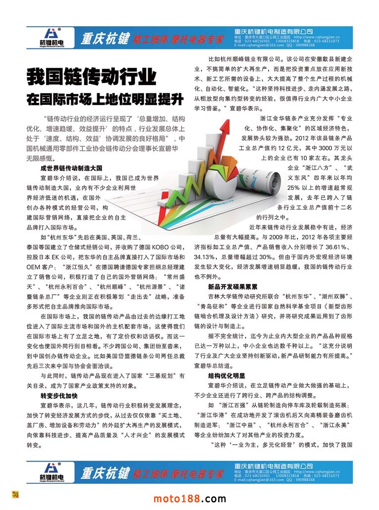 新的变革之后的《摩托车与配件》已经出了四个配件子产业的专题,通过这种形式的变革,我们对摩托车配件的微观行业也有了越来越深入的了解。每一个子行业也都有做得不错的龙头企业,他们在这个子行业里通过横向地拓展,触角伸得也较广泛。比如这一期是链条专题,其实不光摩托车用,电动车、汽车、工业机械....只要需要传动的都有链条的身影。因而许多厂的产品也涉及了多行业,但是我们仅选择与我们产业有关的产品做一般的技术报道;前沿行业作泛泛报道;市场运用方面则是尽可能以广角报道。以前一些企业也在我们杂志上做过宣传,因为我们认识水平浅,不容易突出重点品牌企业,因而在宣传服务上也流于常规。但是通过这期专题后,我们了解到,像东华、恒久、顺峰、双狮、征和等都是这个行业的龙头企业,而且这些龙头企业后劲十足。他们不光在扩大产能生产;更是投入了相当的精力在搞科研;抑或引进国外的先进技术,不光在做大更是在做强,假以时日,他们也会在国际市场上占有一席之地。我们对这些企业充满敬意,他们是民族工业的脊梁。虽然纳税没有房地产企业多,也没有金融和地产业的风光,但他们没有固步自封,也不满足现状,带着创新和发展的精神赶德超日超美,缩短与国际水平的差距,也正是因为有许多像这样的实体产业,中国制造才能真正的做强。那些只制造虚的庞大GDP的、靠吸吮实体产业汁水而滋润的和靠垄断而光鲜的行业,在他们面前是多么的不堪。