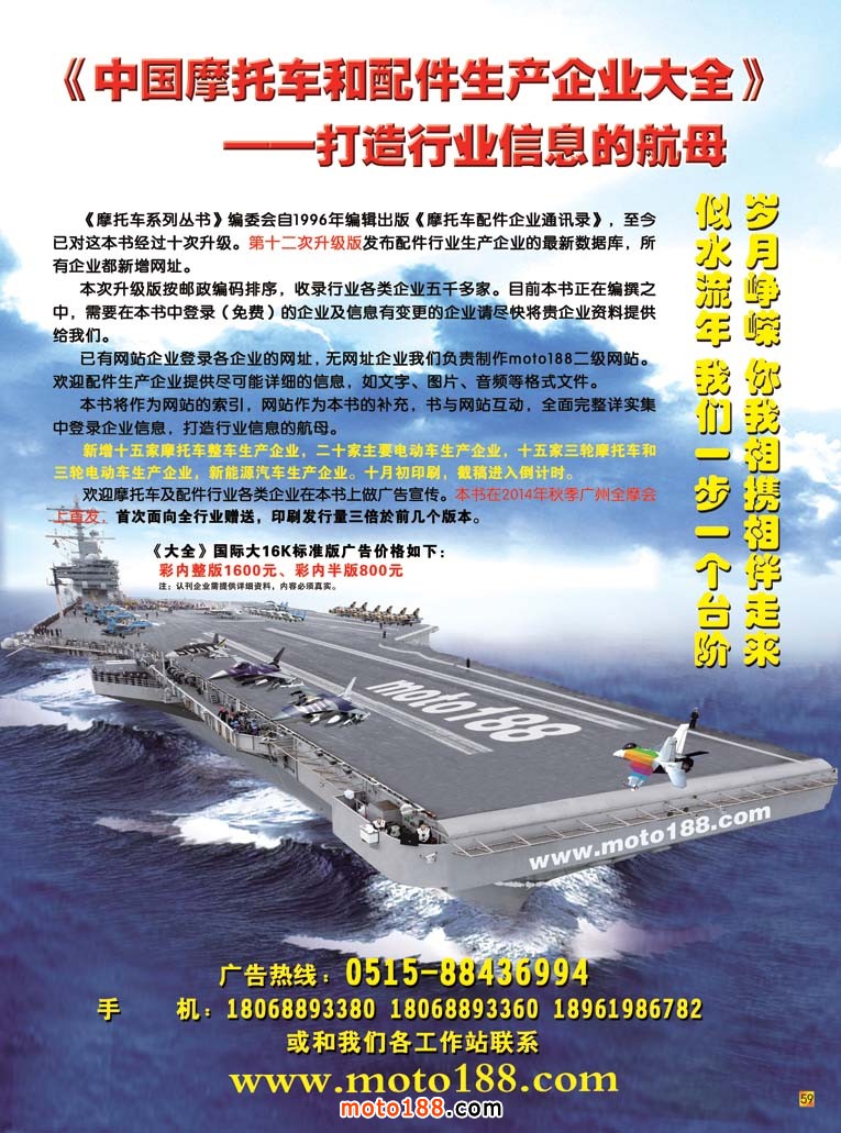 炎热的夏季终将过去,收获的秋天在等待我们,从下一期杂志开始,我们就要为广州全摩会做准备工作了,在这个会上,我们会向全体参会人员奉献两本数据库类书籍,一本是生产厂家的《摩托车配件生产企业大全》,在这一个升级版中,我们新增加十几个大的摩托车整车生产厂家资料,同时增加二十家电动车生产厂家及十几家三轮摩托车和三轮电动车厂家,努力根据市场需要丰富书的内容。还有一本就是第二次升级的《华南市场指南》收集广东和海南两省的经销商资料汇总,其中,广东省的广州市的市场用中英文出版,目前各项工作正紧张有序的进行,欢迎大家在全摩会期间来广州保利展馆分享我们的劳动果实。春种一粒粟,秋收万颗籽。