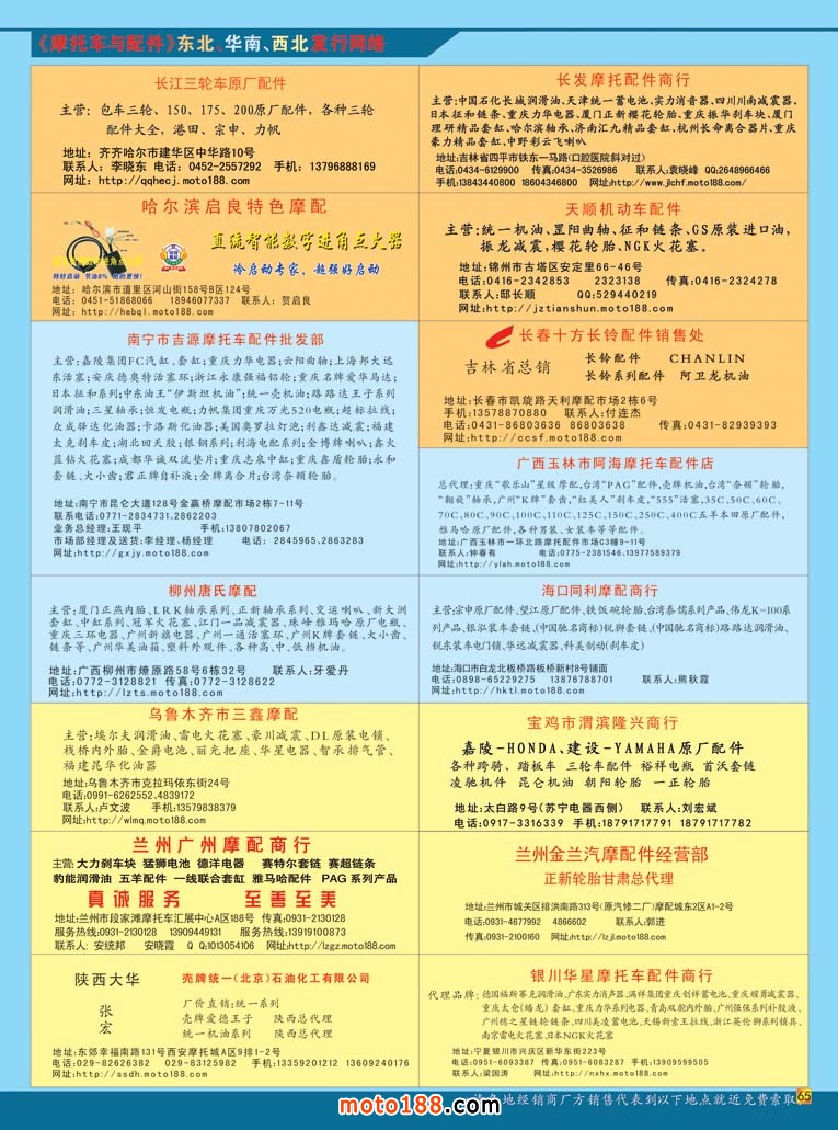 炎热的夏季终将过去,收获的秋天在等待我们,从下一期杂志开始,我们就要为广州全摩会做准备工作了,在这个会上,我们会向全体参会人员奉献两本数据库类书籍,一本是生产厂家的《摩托车配件生产企业大全》,在这一个升级版中,我们新增加十几个大的摩托车整车生产厂家资料,同时增加二十家电动车生产厂家及十几家三轮摩托车和三轮电动车厂家,努力根据市场需要丰富书的内容。还有一本就是第二次升级的《华南市场指南》收集广东和海南两省的经销商资料汇总,其中,广东省的广州市的市场用中英文出版,目前各项工作正紧张有序的进行,欢迎大家在全摩会期间来广州保利展馆分享我们的劳动果实。春种一粒粟,秋收万颗籽。