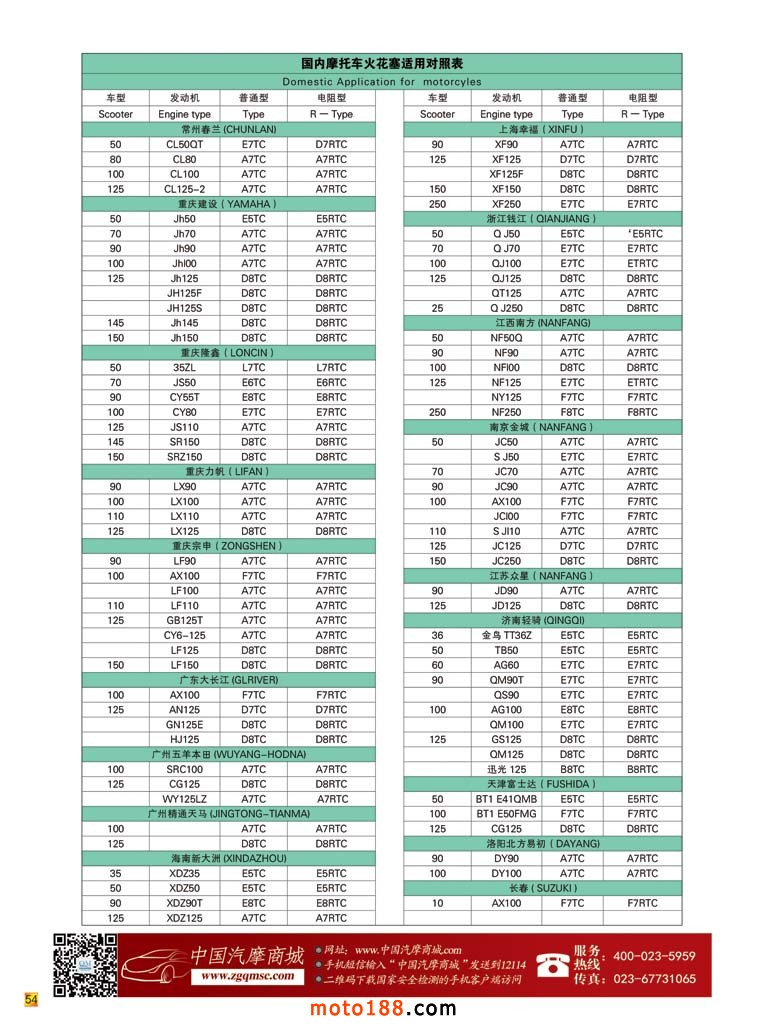 内54 国内摩托车火花塞适用对照表