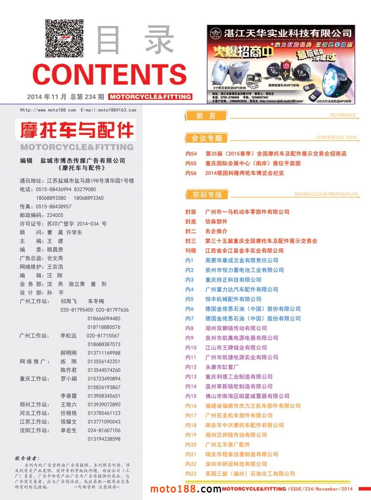 2015年特殊版面预定将在会议结束后正式开始,2015年每月一期,月刊。目前摩托车配件行业虽然只剩我们一家杂志,行业形势也每况愈下,但我们的印量、发行、价格等均保持不变。根据行业、市场的变化,在明年将增加对三轮车行业及电动车配件行业的信息发布。