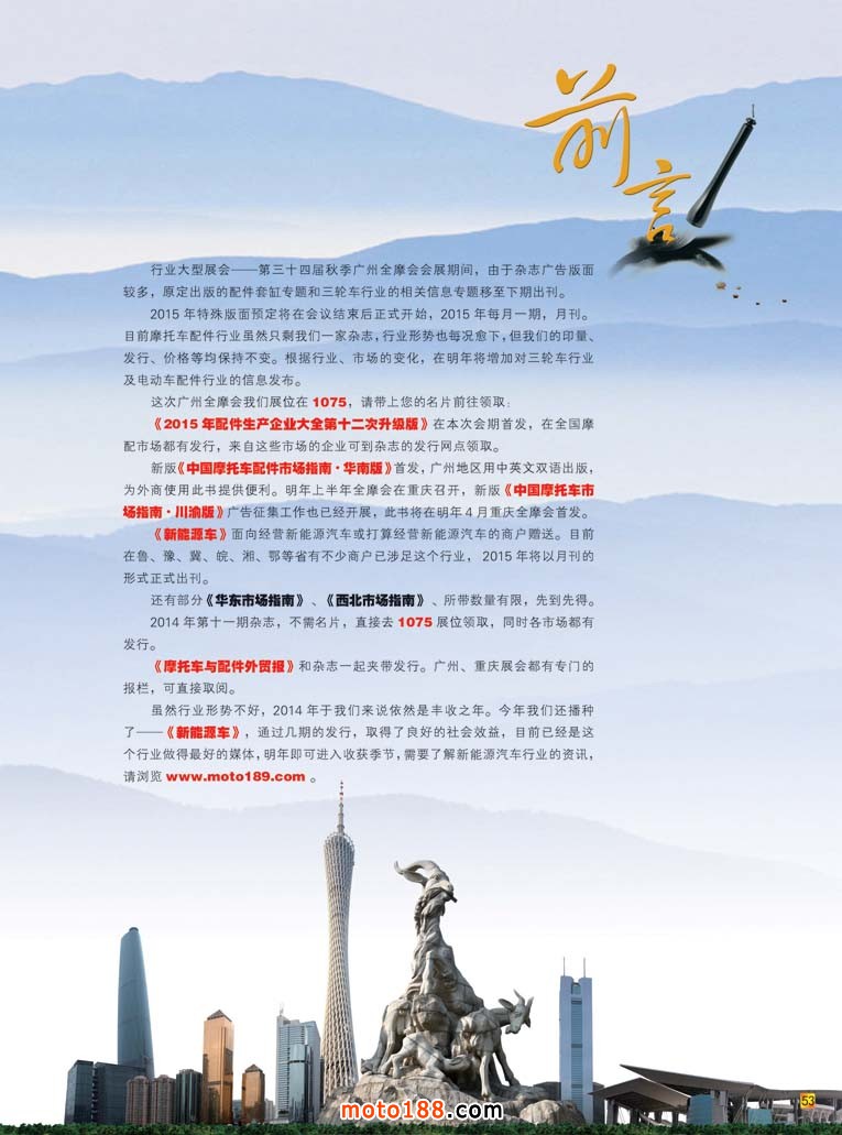 行业大型展会——第三十四届秋季广州全摩会会展期间,由于杂志广告版面较多,原定出版的配件套缸专题和三轮车行业的相关信息专题移至下期出刊。