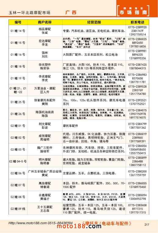 内217 玉林市一环北路摩配市场经销商名录