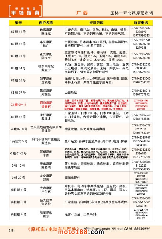 内218 玉林市一环北路摩配市场经销商名录