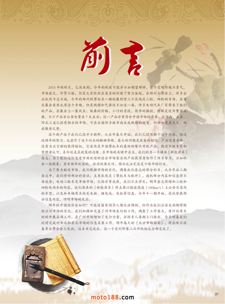 为了努力贴近市场,我们根据市场的变化,调整我们杂志的部分栏目,从今年后二期杂志中,我们将作部分的尝试:主角依然是《摩托车与配件》,通机部分内容和信息将不再选登;电动二轮车是单独市场,已经非常成熟,我们不去涉足;明年杂志将增加三轮和四轮电动车的内容,我们原来的《新能源车》将主要以报道高速(100km/s)上公告目录内的车型,以及和车辆有关的充电桩、锂电池、电机等信息。今年十一期开始,尝试登载部分信息内容,听听市场的反应。