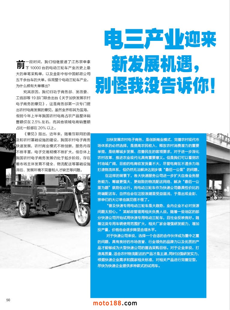 为了努力贴近市场,我们根据市场的变化,调整我们杂志的部分栏目,从今年后二期杂志中,我们将作部分的尝试:主角依然是《摩托车与配件》,通机部分内容和信息将不再选登;电动二轮车是单独市场,已经非常成熟,我们不去涉足;明年杂志将增加三轮和四轮电动车的内容,我们原来的《新能源车》将主要以报道高速(100km/s)上公告目录内的车型,以及和车辆有关的充电桩、锂电池、电机等信息。今年十一期开始,尝试登载部分信息内容,听听市场的反应。