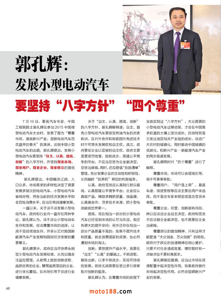 为了努力贴近市场,我们根据市场的变化,调整我们杂志的部分栏目,从今年后二期杂志中,我们将作部分的尝试:主角依然是《摩托车与配件》,通机部分内容和信息将不再选登;电动二轮车是单独市场,已经非常成熟,我们不去涉足;明年杂志将增加三轮和四轮电动车的内容,我们原来的《新能源车》将主要以报道高速(100km/s)上公告目录内的车型,以及和车辆有关的充电桩、锂电池、电机等信息。今年十一期开始,尝试登载部分信息内容,听听市场的反应。
